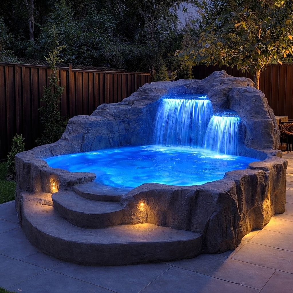 Un spa au design naturel et sculptural, inspiré des bassins minéraux, intégrant une cascade apaisante et un éclairage bleu immersif dans l’eau et la chute, pour une ambiance spectaculaire de jour comme de nuit.