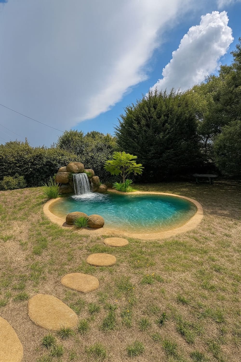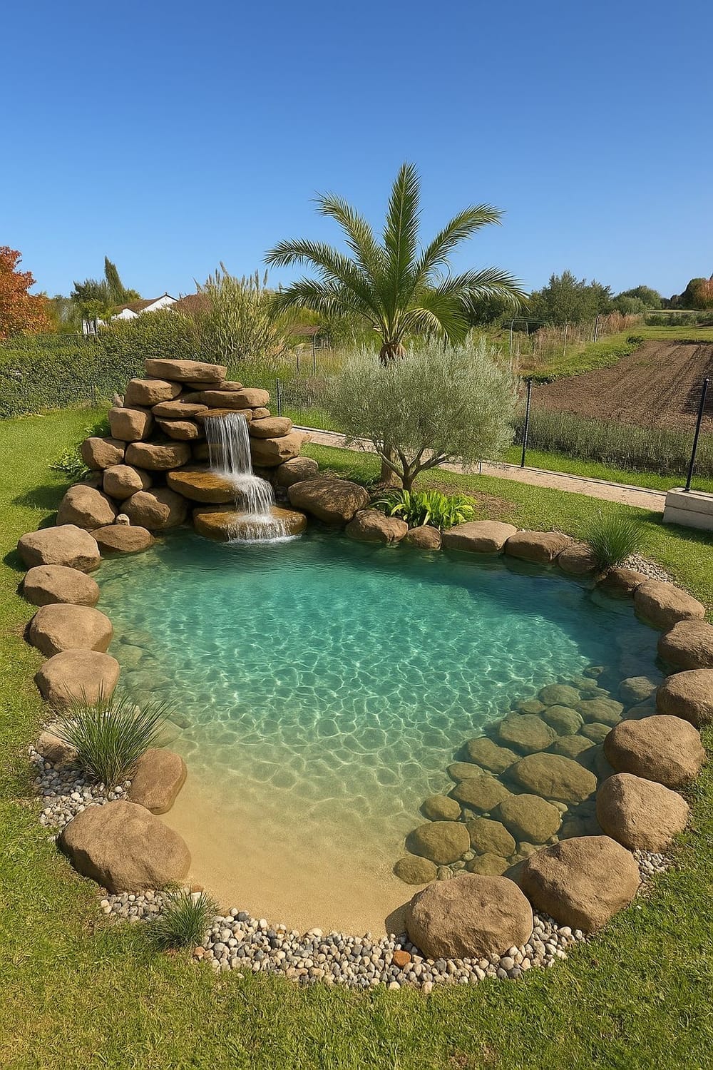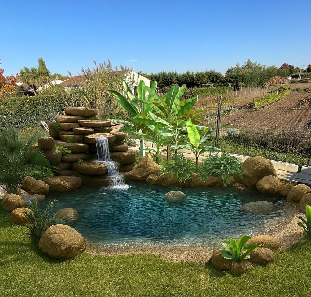 Aménagement autour du bassin inclus (cascade, plantations exotiques, éclairage bassin)