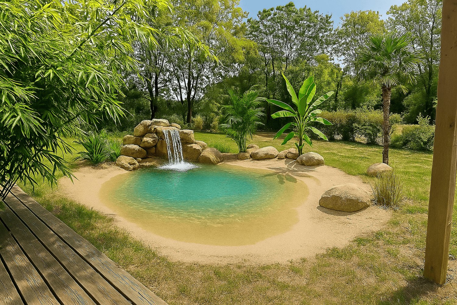 Plage de sable autour du bassin (si version enterrée)